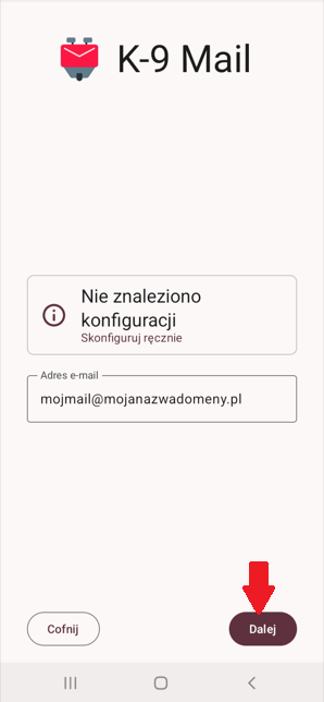 Po przejściu do kolejnego ekranu  otrzymamy komunikat “Nie znaleziono konfiguracji”, w tym przypadku należy kliknąć przycisk Dalej, po czym zostaniemy przekierowani do ręcznej konfiguracji aplikacji.