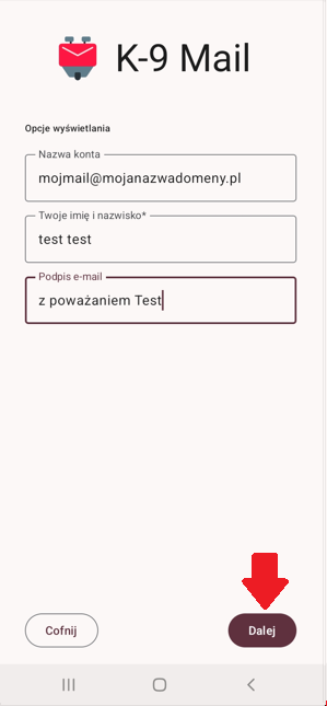 Oraz podpis który będzie podpinany automatycznie do wysyłanej wiadomości. Po wpisaniu odpowiednich informacji ponownie klikamy przycisk Dalej