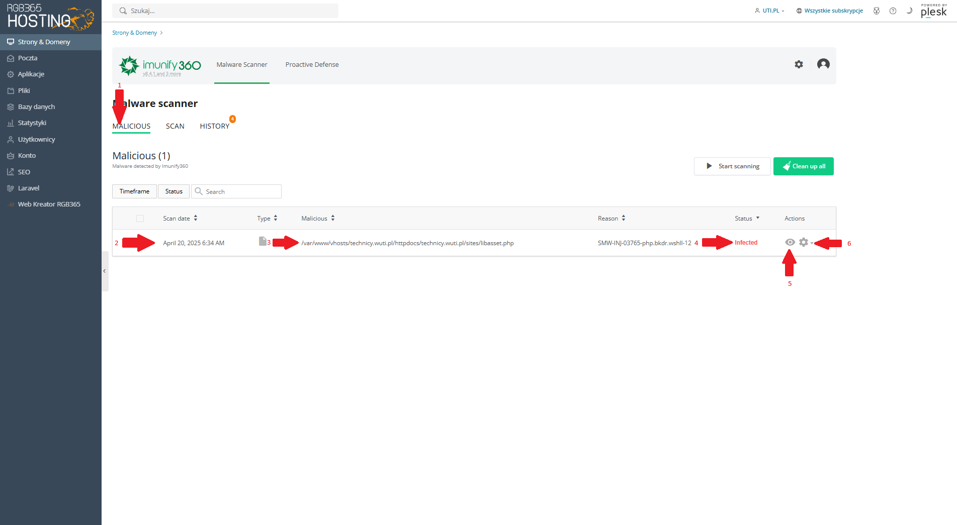 Przycisk „Clean up all” – rozpoczyna automatyczne czyszczenie lub usuwanie wszystkich wykrytych zainfekowanych plików (ten tryb może spowodować uszkodzenie plików strony, jeżeli złośliwy kod został wgrany do oryginalnego pliku strony)