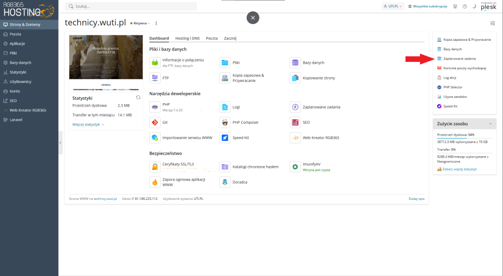 Po zalogowaniu, w menu po prawej stronie należy odnaleźć i kliknąć opcję „Zaplanowane zadania” (czyli CRON).